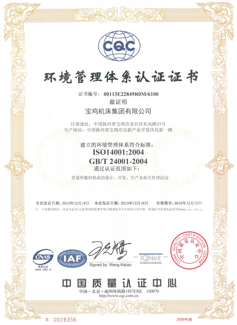 • 環境管理體系認證證書